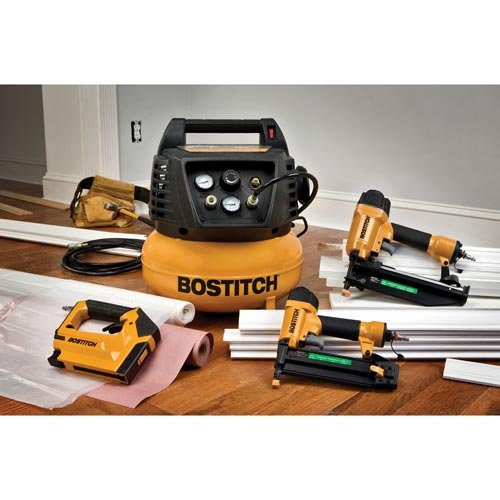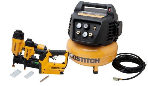 The BOSTITCH BTFP72646 3-Tool and Compressor Combo Kit consists of one brad nailer gun, one finish nailer, one heavy duty crown stapler and one compressor. The SB-1850BN 2” 18 GA Brad Nailer drives 18GA brad nails from 5/8″ to 2″ for a wide variety of applications. This brad nailer features a tool-free depth adjustment, an over-molded no-mar pad, a tool-free jam clearing feature, tool-free 360° exhaust, with a trigger lock-off. The SB-1664FN 16 GA Straight Finish Nailer drives 1-1/4- to 2-1/2-inch, 16-gauge finish nails and weighs only 4 pounds. It features a tool-free depth adjustment, tool-free jam clearing feature, and a tool-free 360° exhaust. The STFP71875 Heavy Duty 3/8″ Crown Stapler drives heavy duty 3/8″ crown staples from 1/4″ to 9/16″. The oil-free operation of this stapler requires no regular maintenance & eliminates the risk of oil stains. It allows for bottom loading for quick reloads, and has a low fastener indicator which allows user to quickly assess when it is time to reload. These three tools are paired with the BTFP02011 6 gallon 150PSI 2.6SCFM pancake compressor. This compressor features high efficiency motor for easy start , a long life oil free, maintenance free pump for convenient use, 80 dBA operational noise level for a quiet work environment, and an impact-resistant composite shroud that protects controls and gauges from jobsite damage.