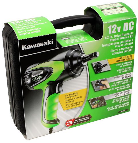 The Kawasaki Impact Wrench Kit 12V DC 80W has no load speed with range of 2500-5500-RPM, and features an 11 foot power cord. Max Torque-280-Feet/-Pound Includes accessories-2 piece double end sockets-11/16-Inch and 3/4-Inch, 13/16-Inch and 7/8-Inch, 2 piece 10A safety fuse, carry case.