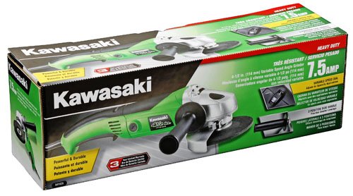 The Kawasaki VS Angle Grinder has no load speed at 3,000 – 11,000-RPM, and input-Amp at 7.5-Amp. Features a wheel diameter of 4-1/2-Inch, Spindle Lock and Spindle Thread of 5/8-Inch, a “Lock-On” switch and 3 side handle positions.