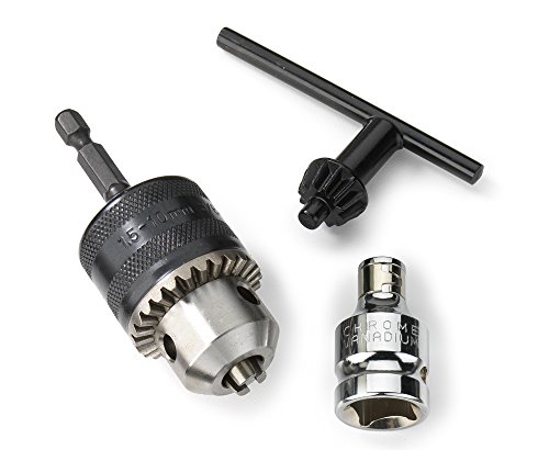 For use with 1/4-inch impact driver or 1/2-inch impact wrench, 3/8-inch chuck allows you to lock and release bits to help keep you on task on the job. Heavy duty design. Special quenching treated key parts increases durability.