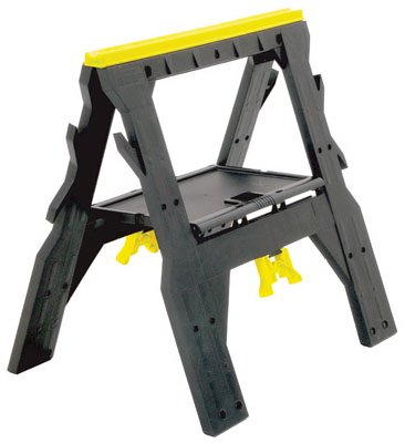 Master Mechanic 2 Pack Heavy Duty Plastic Foldable Sawhorse. The sawhorse is lightweight and can be easily folded for storage. Sawhorse features an anti-slide rubber feet, built in ruler and storage tray. Sawhorse measures 27.17″ x 20.28″ x 30.71″ when open and 27.17″ x 32.48″ x 2.36″ when closed. A pair of heavy duty sawhorse can support 1000lbs.
