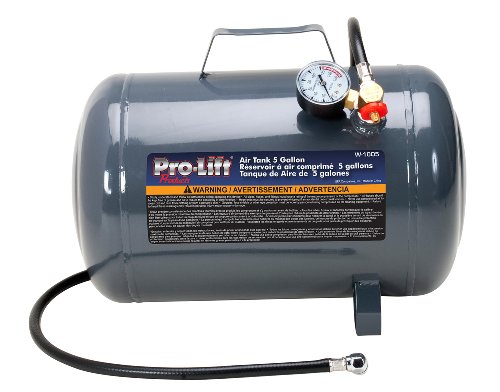 The Pro-Lift 5 gallon air tank is a great light weight air tank to keep your tires and other air actuated equipment inflated. The easily adaptable air hose and fixture gets you set up and pumped up in no time. Sturdy steel construction is proven for extended use.