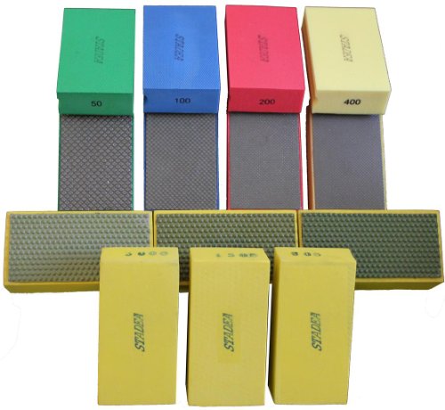 Diamond hand polishing pads are used for polishing, grinding, restoring/cleaning areas hard to reach by polishing tools like wet grinder polisher, angle grinder etc. A useful and handy diamond tool to polish corners, contoured surface like sink, join of two bullnose surface for Granite polishing, Concrete polishing, Marble polishing, Terrazzo polishing, Travertine polishing, glass polishing and their restoration etc. These diamond tools may be used for floor polishing, counter top polishing, stone sculpture polishing etc. It could be useful and cost saver for small polishing project. Hand polishing could be time consuming over polishing using tools like grinders etc. STADEA SUPER A (SPR A) Diamond hand polishing pads set includes 7 polishing pads from starting grit 50 to grit 3000.